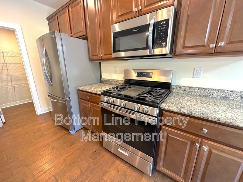 The kitchen is equipped with granite countertops, stainless steel appliances, and a breakfast bar, offering ample cabinet and counter space for all your culinary needs.