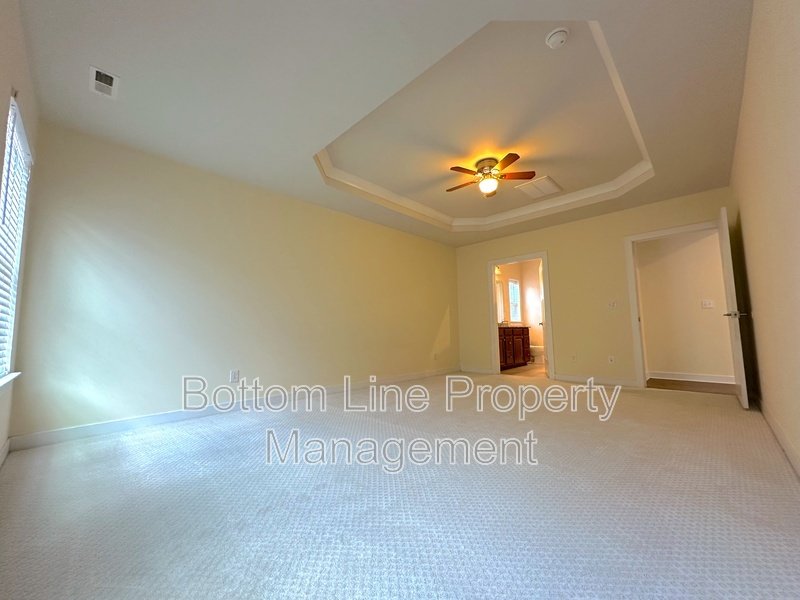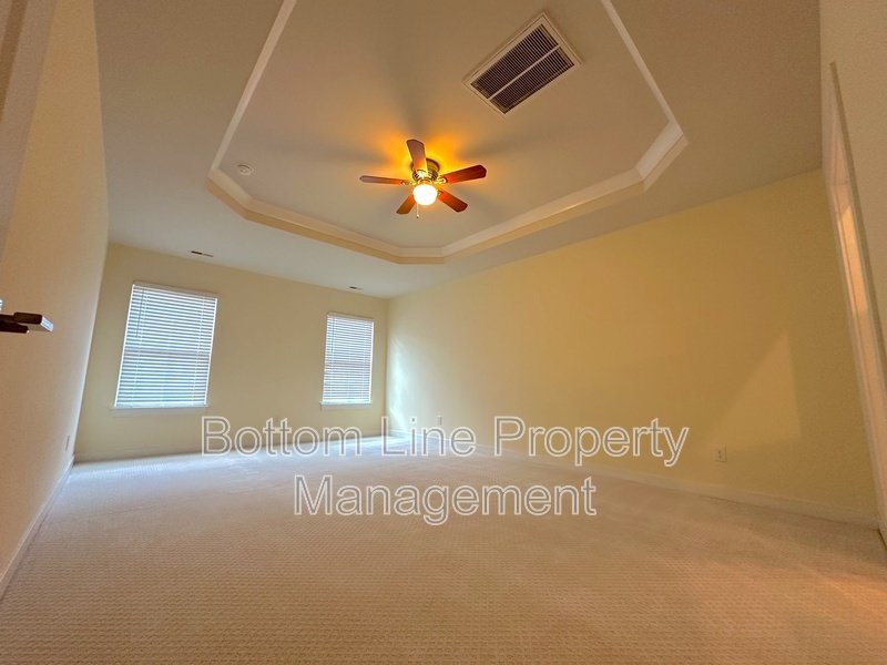 Located on the main level, the expansive primary bedroom includes a tray ceiling and a sitting area surrounded by windows.