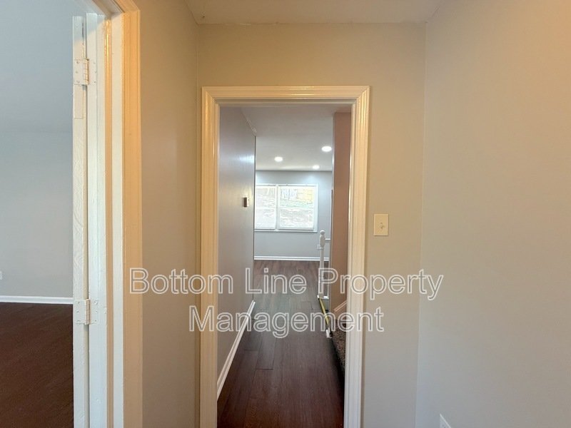 Entry opens into a bright hallway with LVP flooring leading to a formal room or office with large windows and an updated LED light fixture. A coat closet sits just off the main hallway.