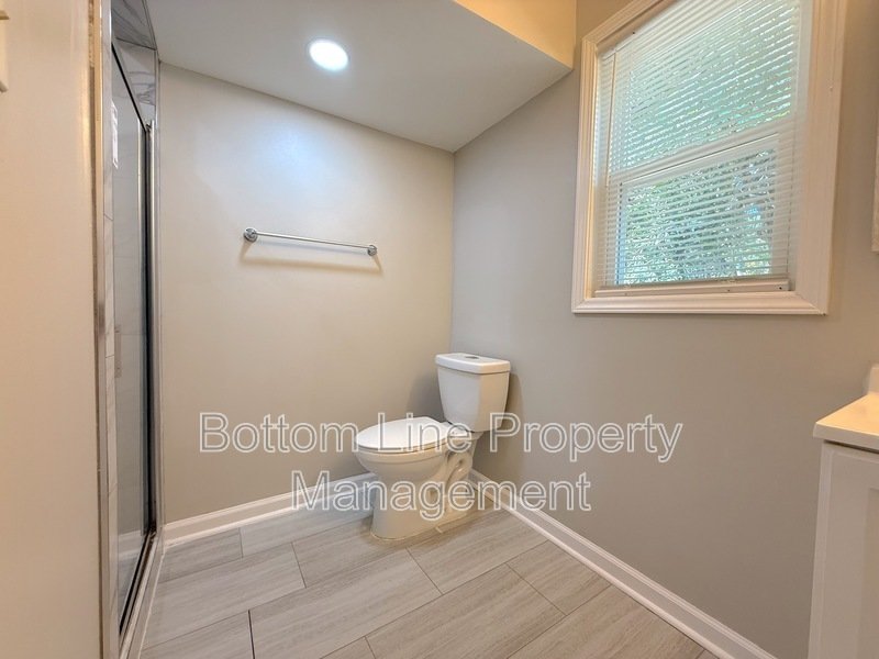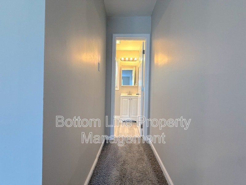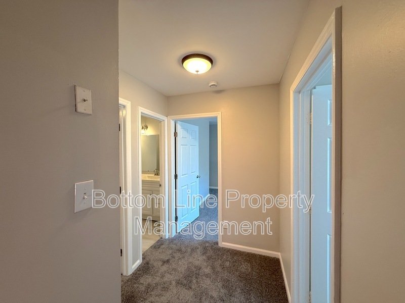 Upstairs, carpeted stairs and hallway lead to two bedrooms with wardrobe closets, a hallway linen closet, and a shared full bathroom with tub/shower combo. At the end of the hall is a primary bedroom with wardrobe closet and a private en-suite bathroom featuring tile flooring and a tiled shower with glass door.