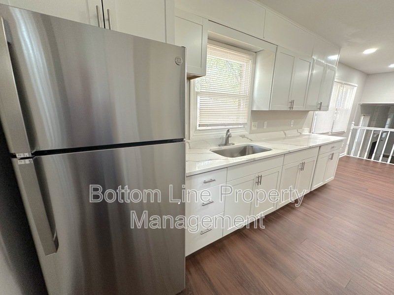 This newly renovated kitchen features designer quartz countertops, a black refrigerator, electric stove/oven with range hood, ample cabinetry, and a pantry closet. An adjacent dining area adds convenience and flow.