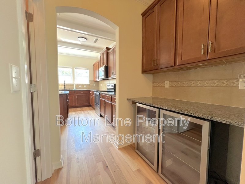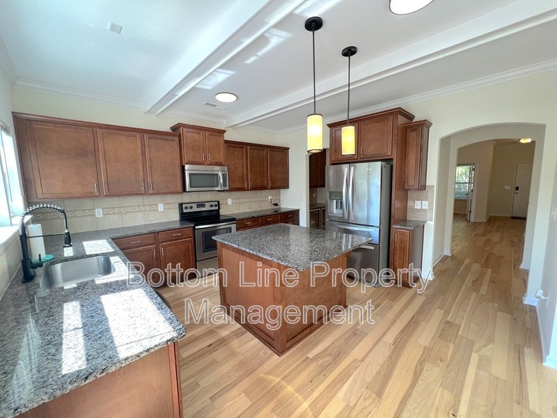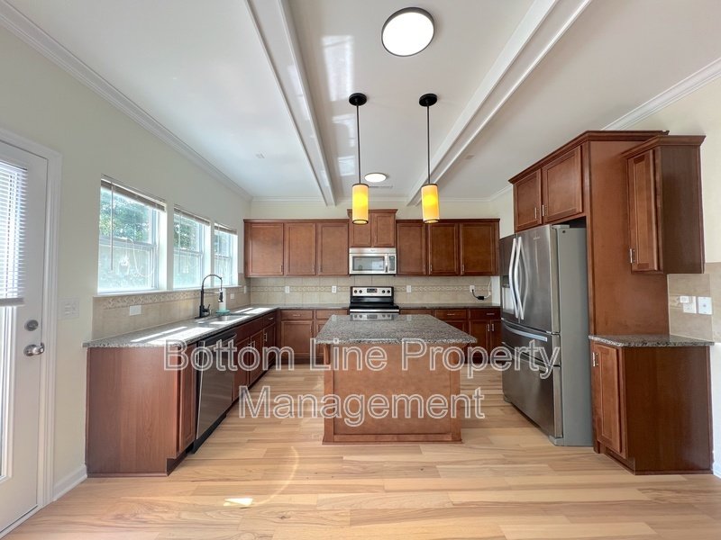 Chef-Ready Kitchen: Granite countertops, stainless steel appliances, center island with pendant lighting, and a charming beamed ceiling enhance both function and aesthetic.