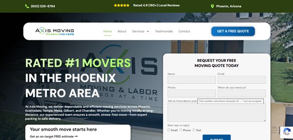 Axis Moving is a locally owned moving company based in Phoenix, Arizona, providing residential and office relocation services. Operating within a 40-mile radius for local moves, the company also offers long-distance services to and from Phoenix. Axis Moving is licensed and insured, serving customers across the Greater Phoenix metro area, including Phoenix, Scottsdale, Tempe, Mesa, Gilbert, Chandler, Glendale, and Peoria.